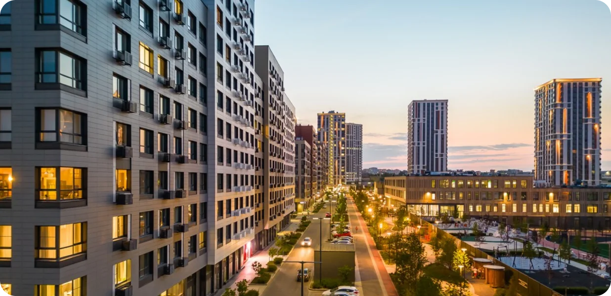 Построен комплекс разновысотных зданий – 10 башен до 28 этажей и 5 малоэтажных кварталов.