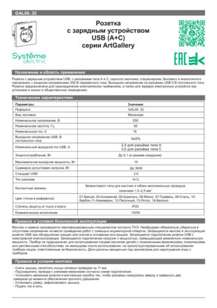 Розетка+USB(A+C) GAL00..32 серии ArtGallery руководство по эксплуатации