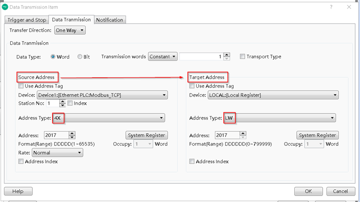 - В этом элементе в закладке Trigger and Stop выбираем условия запуска передачи данных (например запуск при открытии этого окна), а в закладке Data Transmission задаем направление передачи данных, тип передаваемых данных, и количество, начальные адреса ячеек памяти регистров в Источнике и Приемнике. Я назначил в качестве источника данные из удаленного устройства Power Meter с начальным адресом %MW2017 , а в качестве приемника – внутреннюю область памяти панели с начальным адресом LW2017, как и было ранее оговорено в настройках Modbus_TCP_Server-а.
