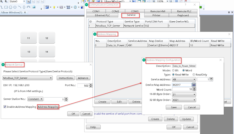 - Открываем Таблицу Address Mapping и создаем запись, в которой определяем тип данных переменных и совместные области памяти как в области памяти удаленных устройств Service Address «4Х», так и в области локальных данных панели Device Map Address например «LW» .
