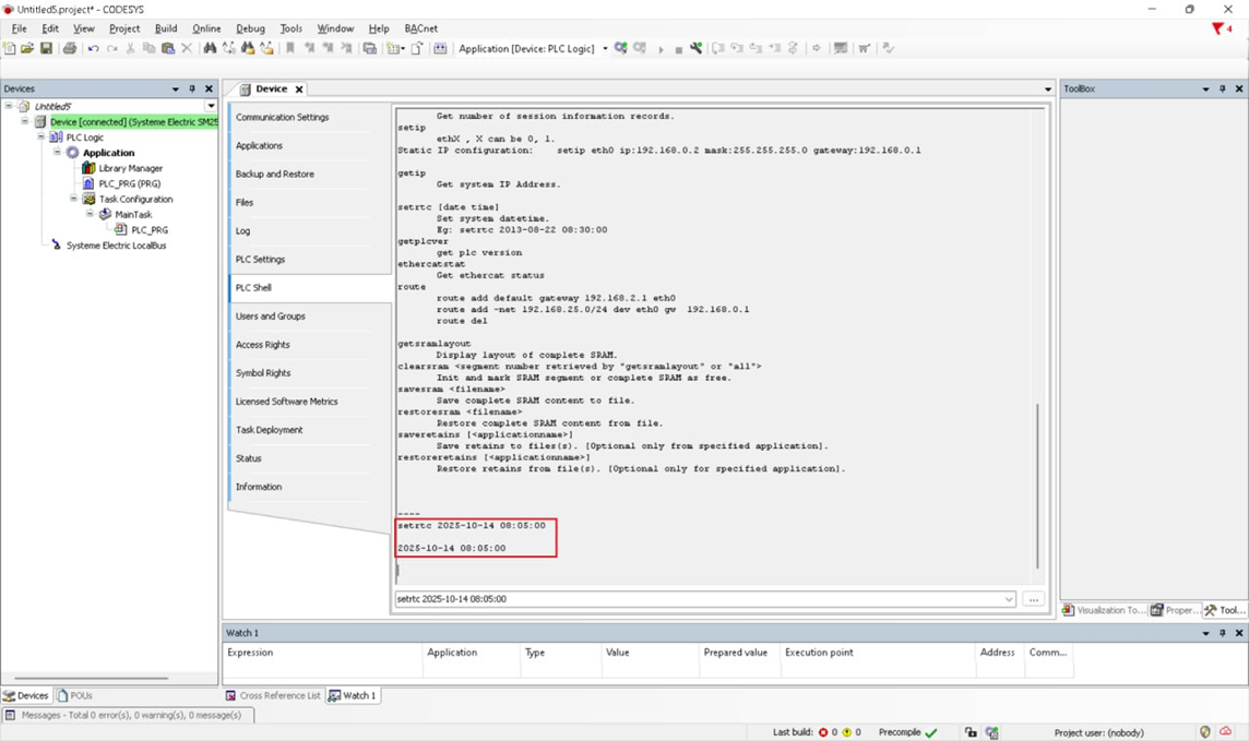 Результатом выполнения команды будет её подтверждение с выводом текущего времени часов реального времени (RTC) контроллера.