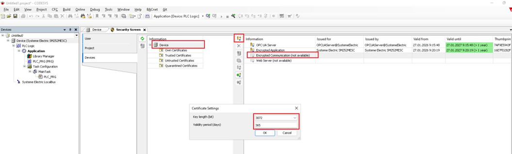 5. Поочередно выделяйте сертификаты в правой части экрана и нажимайте на кнопку «Create a new certificate on the device». В открывшемся окне задайте параметры сертификата: длина ключа и срок действия (в днях). По умолчанию установлен срок действия 365 дней, его можно выбрать на любой другой срок. На копии экрана ниже обозначены основные моменты выбора.