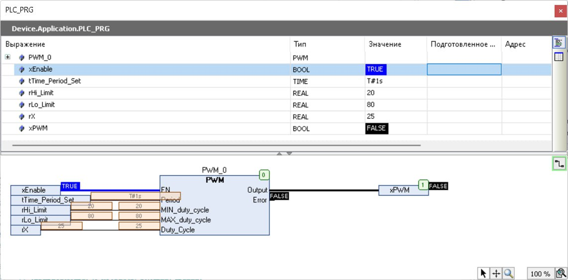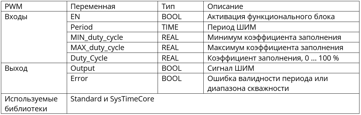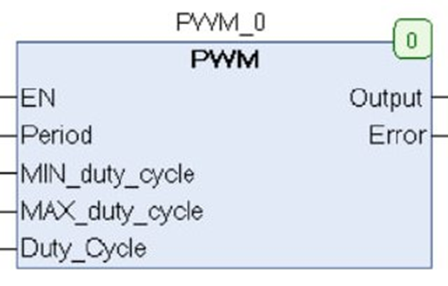 Функциональный блок PWM формирует ШИМ сигнал на выходе Output с заданным периодом (вход Period) и определённым значением заполнением (0 … 100 % ) на входе Duty_Cycle. Имеется возможность ограничить скважность минимальным и максимальными значением, который задаются на входы MIN_duty_cycle и MAX_duty_cycle соответственно (по умолчания задан диапазон 10 … 90 %).
