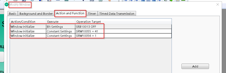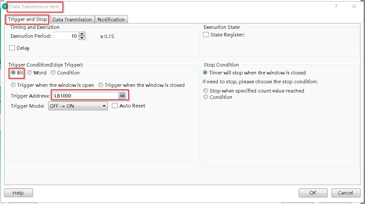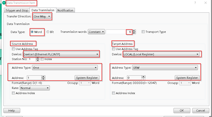 Как вариант мы можем назначить передачу этих 6 слов непосредственно в свойствах окна, на котором мы расположили компоненты вывода даты и времени. Для этого в нашем проекте в закладке Component ->Timer and Data Transmission ->Timed Data Transmission нажимаем кнопку Add Items в секции Trigger and Stop, задаем условия запуска передачи данных, а в секции Data Transmission указываем тип данных, откуда и куда передаем (начальные адреса) и сколько слов.
