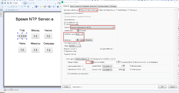Добавим на экран нашего проекта несколько компонентов «Numeric Value Display» для отображения времени NTP сервера.