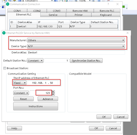 В конфигурации вашего проекта в среде программирования SystemeHMI Studio -> Communication Connection -> Remote Connection-> Ethernet PLC в строке Manufacturer выберите «Other» и добавьте Device Type «NTP».