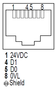 Коммуникационный разъём RJ45 Modbus расположен в верхней части модуля IFM, для его подключения необходимо использовать коммуникационный кабель с вилочной частью RJ45 и концом открытого типа. Распиновка штекера RJ45 представлена ниже.
