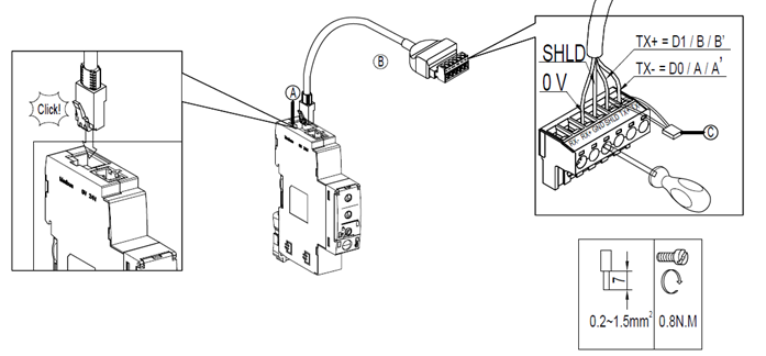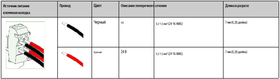 К свободный концу коммуникационного кабеля подключается питание таким образом, чтобы «+» соответствовал пину 24VDC, а «-» - пину 0. D1 и D2 – коммуникационные пины. D1 соответствует А+, D0 соответствует B-.