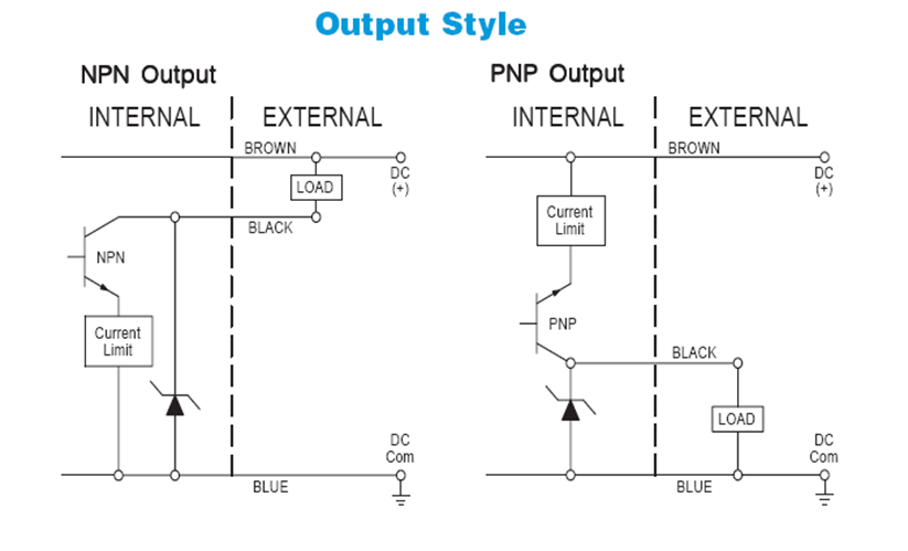 Почему две схемы? Существуют инкрементальные энкодеры, у которых имеется полный набор выходов (А, /А, B, /B, Z, /Z), как «прямой» (А, B, Z), так и «инверсной» (/А, /B, /Z), но могут встречаться энкодеры в которых присутствуют только один тип выходов, прямой или обратный (инверсный). Другое обозначение прямой и обратной полярности, это «источник» и «приёмник» или PNP или NPN. PNP и NPN чаще встречается в обозначении датчиков и это определит схему подключения используемого датчика. Датчики с «сухим» контактом упоминать не следует, так как это относится к электромеханическим устройствам, и применение их с быстрыми входами нецелесообразно. Ниже я привёл типовую схему подключения датчиков (индуктивные, емкостные, оптические и т.д.).
