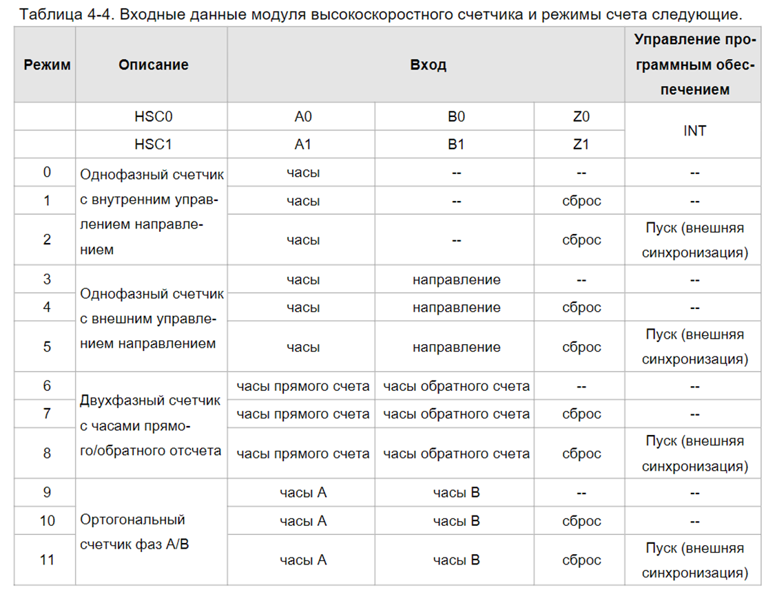 Таблица позволяет соотнести режим (левый столбец таблицы) работы одного из двух счётчиков (HSC0 или HSC1), требуемого функционала и используемых каналов счётчиков. Рассмотрим режимы работы. Режимы работы можно разделить на 4 группы: Однофазный счётчик, однофазный счётчик прямого и обратного счёта, двухфазный счётчик прямого и обратного счёта и двухфазный счётчик с сдвигом фазы (инкрементальный энкодер).