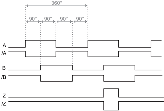 Так же каждый канал энкодера может иметь по два электрических сигнала и в итоге типовой набор сигналов выглядит так: А, /А, B, /B, Z, /Z, («/» - графически рисуется над соответствующей буквой и означает отрицание).