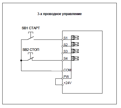 Р05.04=3 назначение на дискретный вход S4 функции 3-Х ПРОВОДНОЕ УПРАВЛЕНИЕ;