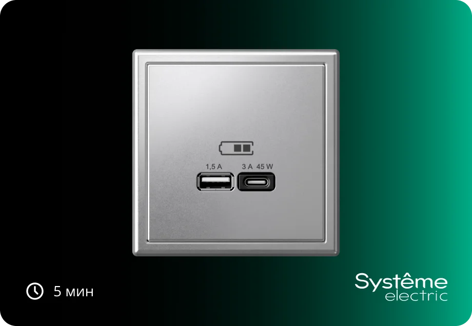 - Power Delivery (PD). Предназначен для быстрой зарядки устройств с разъемом Type-C и выдает до 60 Вт мощности. Такая технология синхронизирует уровень напряжения и заряда батареи для продления срока службы портативного аккумулятора гаджета. PD широко распространена в продукции Apple. В розетках Systeme Electric используется PD 3.0 with PPS с гибким режимом зарядки благодаря настройке дискретного уровня заданного напряжения с минимальным шагом.