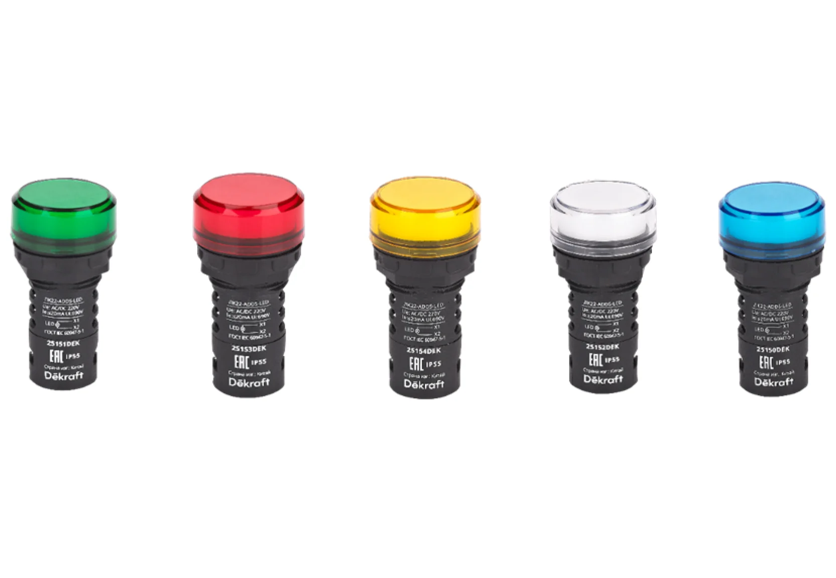 Ассортимент ламп коммутационных ЛК-22 IP55 включает в себя устройства с универсальным напряжением питания (AC/DC) на 12, 24, 110, 220 В, а также только с переменным напряжением питания (AC) на 220 и 380 В.
