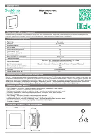 Переключатель Systeme Electric (ранее Schneider Electric) BLANCA (белый, скрытой установки) одноклавишный предназначен для сетей до 250В, на ток до 10А. Переключатель позволяет управлять одним источником света из двух точек. Его можно установить, например, в двух концах коридора, у входа в комнату или у кровати. Корпус изделия выполнен из ABS-пластика.