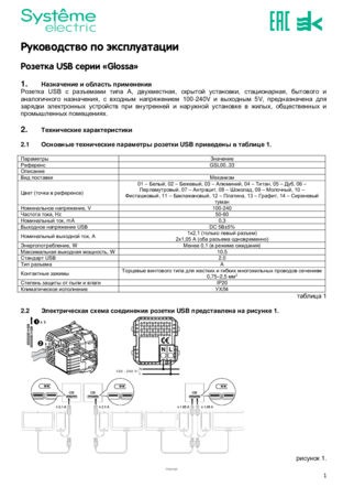 Механизм Systeme Electric (ранее Schneider Electric) серии Glossa (цвет антрацит) розетки с двумя разъёмами USB с выходными напряжением 5 В постоянного тока и выходами с номинальным током по 2,1 А. Предназначен для зарядки мобильных устройств: телефоны, планшетные компьютеры, mp3/mp4 плееры. Может заряжать одно или два устройства одновременно. Выполнен из материала PС+ASA, стойкого к УФ-излучению и появлению царапин.
